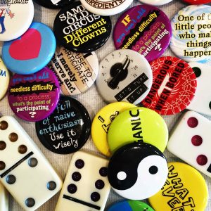 I created a collection of pin-back buttons with witty sayings that are a tried-and-true resource for transitioning into a classroom or workshop space that I call the “Conversation Starter Buttons.” They bring humor into group settings where individuals are reluctant to participate, helping them buy into the group process with some laughter.