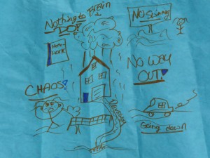 I taped large lengths of butcher paper on the walls. As students entered the classroom I had them choose their favorite color marker. I set up the activity by asking them to imagine that they are graffiti artists and that this is their can of spray paint. They have been given permission by a store owner to decorate the wall with graffiti to describe their experiences, thoughts, reflections, questions regarding the flood, what it has been like starting school amidst the recovery, the late start to the school year and what it is like to be an 8th grader. I asked them to use artwork or words and explained that like a real wall of graffiti others can add to or comment on their artwork or musings. I encouraged them to do this silently (probably an unrealistic challenge for middle schoolers, but something that has been helpful when I have facilitated this activity with older groups).