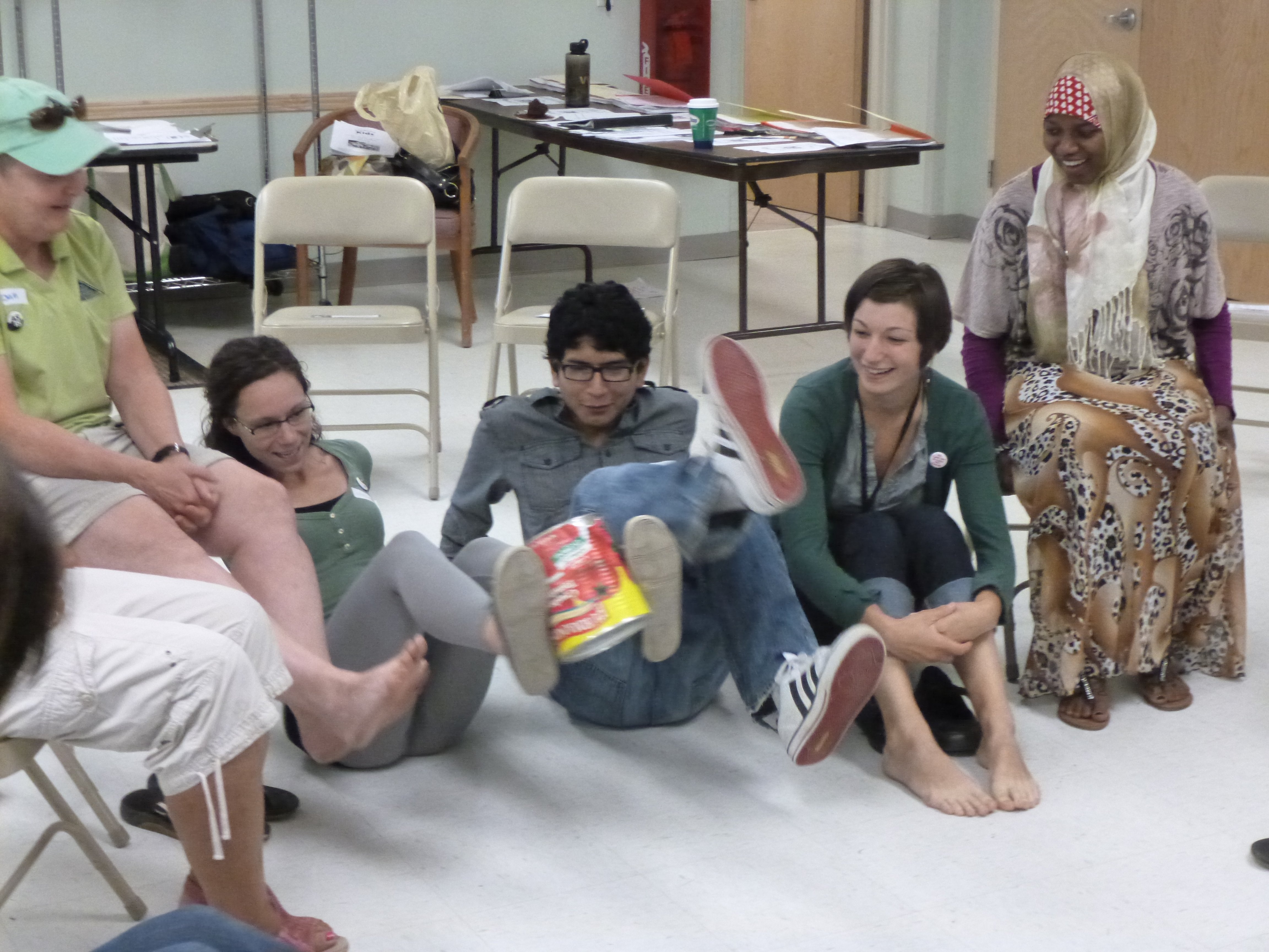 • Challenge the group to pass the can around the circle using only their feet (specify that this means below the ankle) without dropping it.