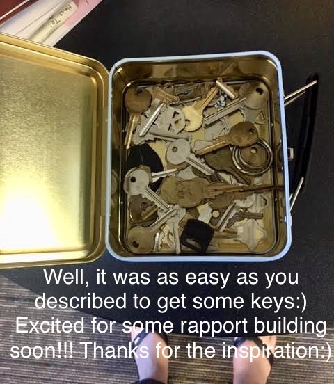 The possibilities for using keys in a metaphorical way are endless. Use your creativity! At the very least having them on hand in your toolkit as a playful interactive way for group members to find partners for pair sharing conversations (see blog post). Contact me for copies of the “Key Reflection” worksheets I’ve used that you can adapt to your programs.
